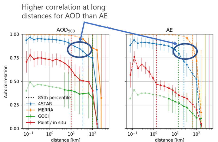 Aerosol particles can be emitted, transported, removed, or transformed, leading to aerosol variability at scales impacting the climate (days to years and over hundreds of kilometers) or the air quality (hours to days and from meters to hundreds of kilometers). We present the temporal and spatial scales of changes in AOD (aerosol optical depth) and aerosol size (using Ångström exponent – AE; fine-mode fraction – FMF) over Korea during the 2016 KORUS-AQ (KORea–US Air Quality) atmospheric experiment. We use measurements and retrievals of aerosol optical properties from airborne instruments for remote sensing (4STAR; Spectrometers for Sky-Scanning Sun-Tracking Atmospheric Research) and in situ (LARGE; NASA Langley Aerosol Research Group Experiment) on board the NASA DC-8 and geostationary satellites (GOCI; Geostationary Ocean Color Imager; Yonsei aerosol retrieval – YAER, version 2) as well as from reanalysis (MERRA-2; Modern-Era Retrospective Analysis for Research and Applications, version 2). Measurements from 4STAR when flying below 1000 m show an average AOD at 501 nm of 0.36 and an average AE of 1.11 with large standard deviation (0.12 and 0.15 for AOD and AE, respectively), likely due to mixing of different aerosol types (fine and coarse mode). The majority of AOD due to fine-mode aerosol is observed at altitudes lower than 2 km. Even though there are large variations, for 18 out of the 20 flight days, the column AOD measurements by 4STAR along the NASA DC-8 flight trajectories match the South Korean regional average derived from GOCI. GOCI-derived FMF, which was found to be slightly low compared to AErosol RObotic NETwork (AERONET) sites (Choi et al., 2018), is lower than 4STAR’s observations during KORUS-AQ. Understanding the variability of aerosols helps reduce uncertainties in the aerosol direct radiative effect by quantifying the errors due to interpolating between sparse aerosol observation sites or modeled pixels, potentially reducing uncertainties in the upcoming observational capabilities. We observed that, contrary to the prevalent understanding, AE and FMF are more spatially variable than AOD during KORUS-AQ, even when accounting for potential sampling biases by using Monte Carlo resampling. Averaging between measurements and models for the entire KORUS-AQ period, the reduction in correlation by 15 % is 65.0 km for AOD and shorter at 22.7 km for AE. While there are observational and model differences, the predominant factor influencing spatial–temporal homogeneity is the meteorological period. High spatiotemporal variability occurs during the dynamic period (25–31 May), and low spatiotemporal variability occurs during the blocking pattern (1–7 June). While AOD and FMF AE are interrelated, the spatial variability and relative variability of these parameters in this study indicate that microphysical processes vary at scales shorter than aerosol concentration processes at which microphysical processes such as aerosol particle formation, growth, and coagulation mostly impact the dominant aerosol size (characterized by, e.g., FMF AE) and to some degree AOD. In addition to impacting aerosol size, aerosol concentration processes such as aerosol emission, transport, and removal mostly impact the AOD.
